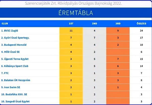 A végleges éremtáblázatból kiderül, hogy a Hód Úszó SE történetének legsikeresebb országos bajnokságán van túl, ugyanis az előkelő 4. helyen végeztünk. Olyan nagymúltú és sikeres egyesületeket előztünk meg, mint például a Kőbánya Sport Club, az Újpesti Torna Egylet és az FTC.